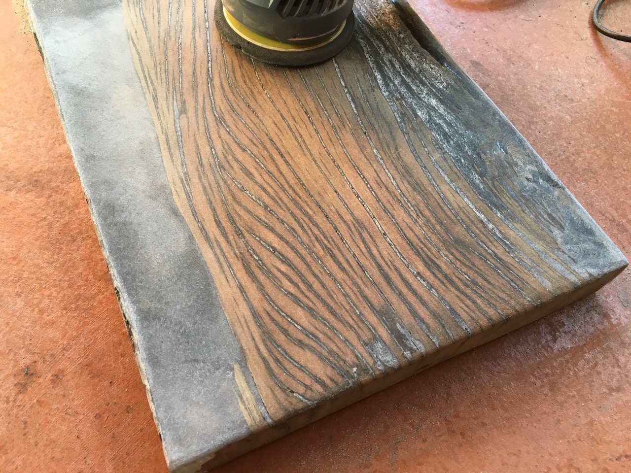 Based on my previous experience with the TV unit sanding, I decided to take on a different approach. Instead of sanding all the resin I used a power plane to cut all the excess off. It looked quite ugly after this because lots of resin chipped, but that wasn't going to affect the final piece too much so I wasn't worried.