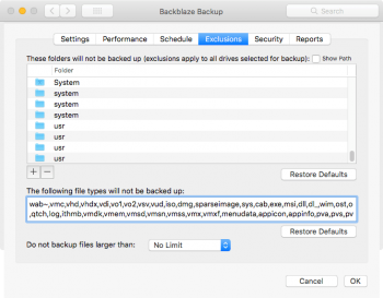 Of course since I wanted to back up my external drives the default settings were not right for me. I also wanted to add additional exclusions since a part of the space on my external drives was being used to duplicate data I had on my system drive. To get started with setting it up how I wanted BackBlaze to run, I went into the preferences and selected my external disks for backup. I then set performance options to favour faster backup - I wasn't going to use continuous backup so it had to run as fast as possible when I chose to run it.